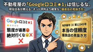 不動産屋のGoogle口コミが低くて不安な方へ。現役店長が、口コミが荒れやすい理由と見方を解説。★評価より確実な判断材料「免許番号( )の数字」と、損しない店の選び方を紹介します。