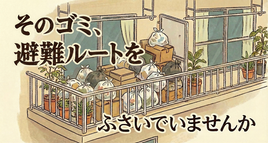 • ベランダは「専用使用できる共用部分」=避難経路。私物のゴミ置き場ではありません。