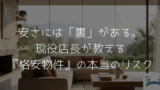 実は、家賃を極端に下げると、こういう「マナーの守れない隣人」に遭遇する確率(隣人ガチャのリスク)は高くなります。 その「安さの裏側」については、こちらの記事で詳しく本音を書いています。