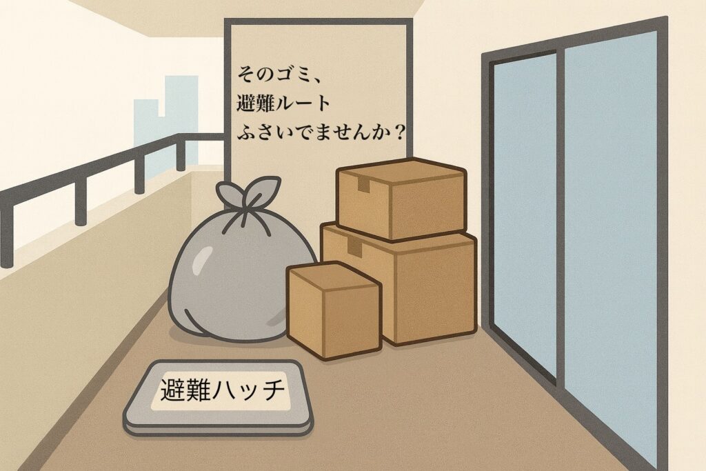 • ベランダは「専用使用できる共用部分」=避難経路。私物のゴミ置き場ではありません。
