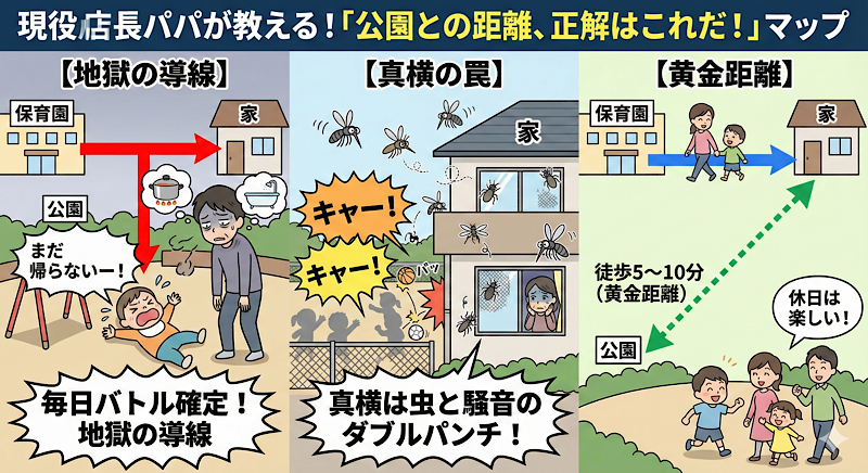 「保育園→家」の一直線の導線上に公園がある物件は、地獄コースになりやすいです。