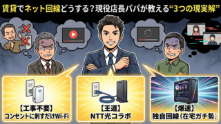 不動産 賃貸でネット回線どうする?現役店長パパが教える“3つの現実解” 「ネット無料物件は本当にお得?」J:COM指定で遅い、工事NGで困る…。そんな賃貸のネット問題を、現役不動産店長が“3つの現実解”で一撃解決。無料Wi-Fiの落とし穴から速度重視の独自回線、大家への工事交渉のコツまでわかりやすく解説します。 2025.12.06 不動産